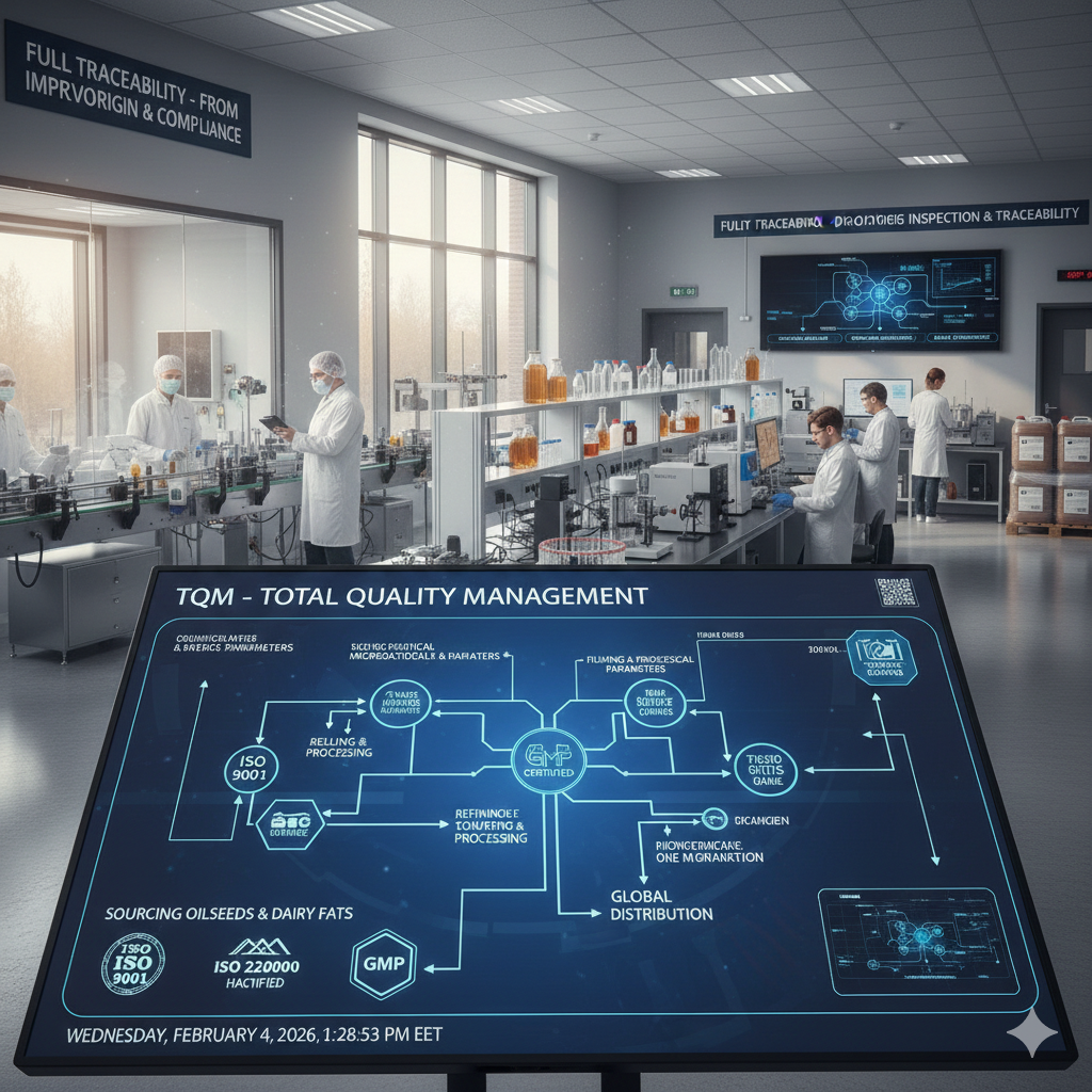 Our operations are aligned with Total Quality Management integrated system complying with ISO 9001 (Quality Management Systems), ISO 22000 (Food Safety Management Systems), HACCP, BRCGS, FSSC22000 and GMP guidelines. These frameworks govern every stage of our value chain from oil sourcing, to refining, processing, filling, and distribution.
